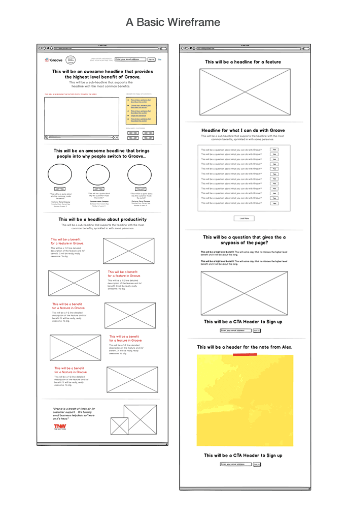 So, using Balsamiq, we built a very basic wireframe of a long-form page, guided by design elements from sites that we liked (and knew converted well), like CrazyEgg’s and a 2011 sales page for Highrise from the team at Basecamp (formerly 37Signals), among others.