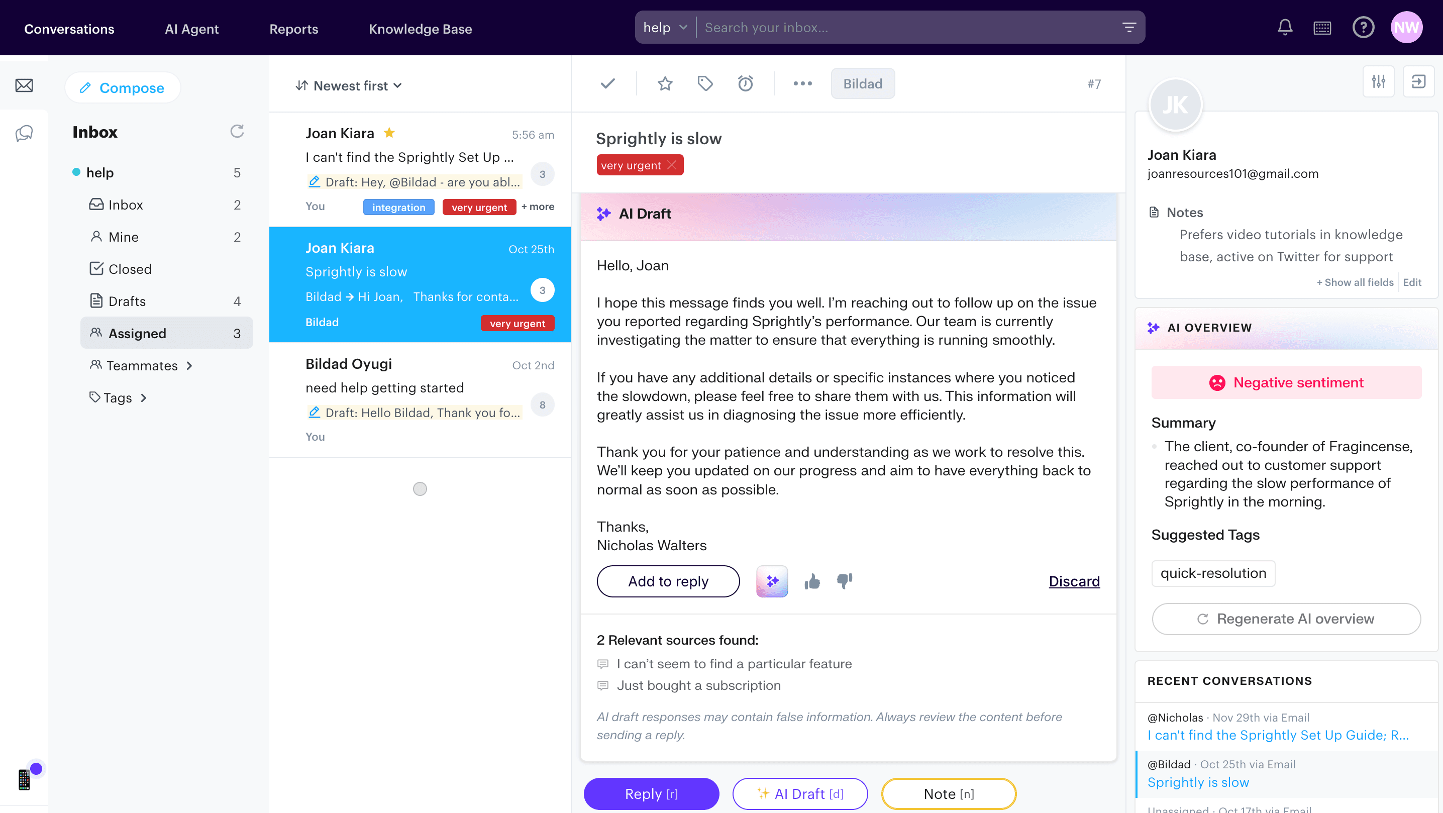 Groove’s AI tools provide an immediate content summary of the email, suggest tags, and detect customer sentiment to ensure your agent has a grasp of: