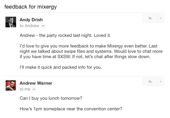 He was throwing a party at SXSW, and I could tell from listening to his interviews that he’s always craving and asking for audience feedback.