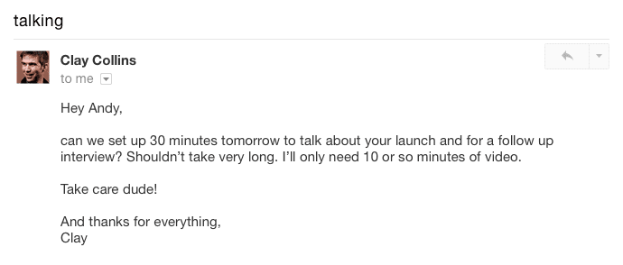 It was so cool to become friends with Clay. I remember reading his content online for so long. But I never thought we’d actually end up hanging out together. Since that experience, I realized this is a ninja hack for getting in touch with influencers who are normally unreachable.