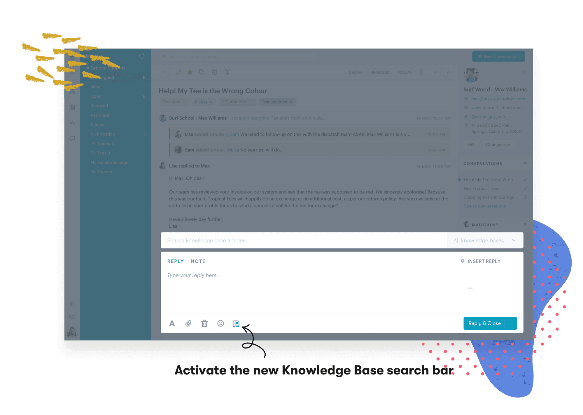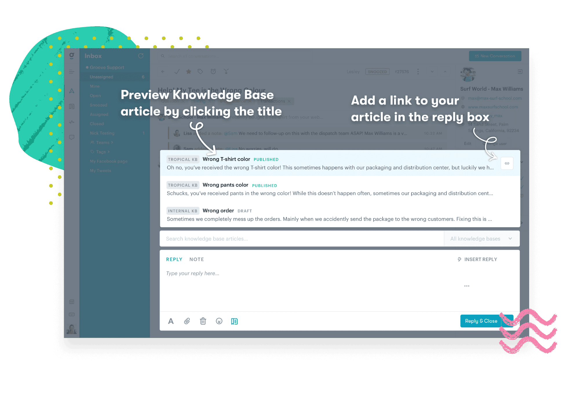 - Effortlessly insert a Knowledge Base article directly into a reply