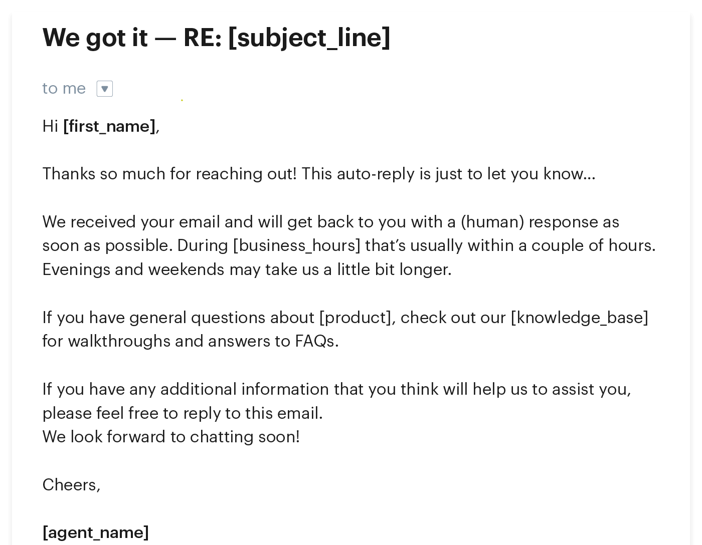 We received your email and will get back to you with a (human) response as soon as possible. During [business_hours] that’s usually within a couple of hours. Evenings and weekends may take us a little bit longer.