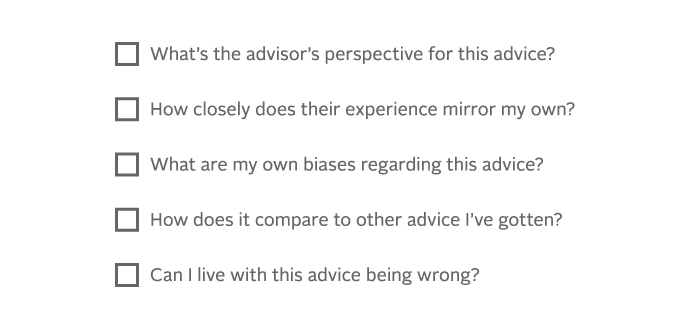 Over time, I’ve honed in on five questions that I ask myself about every piece of advice that I’m considering. I’ve found these questions to be really valuable when it comes to deciding how to act on advice, or if I even should.