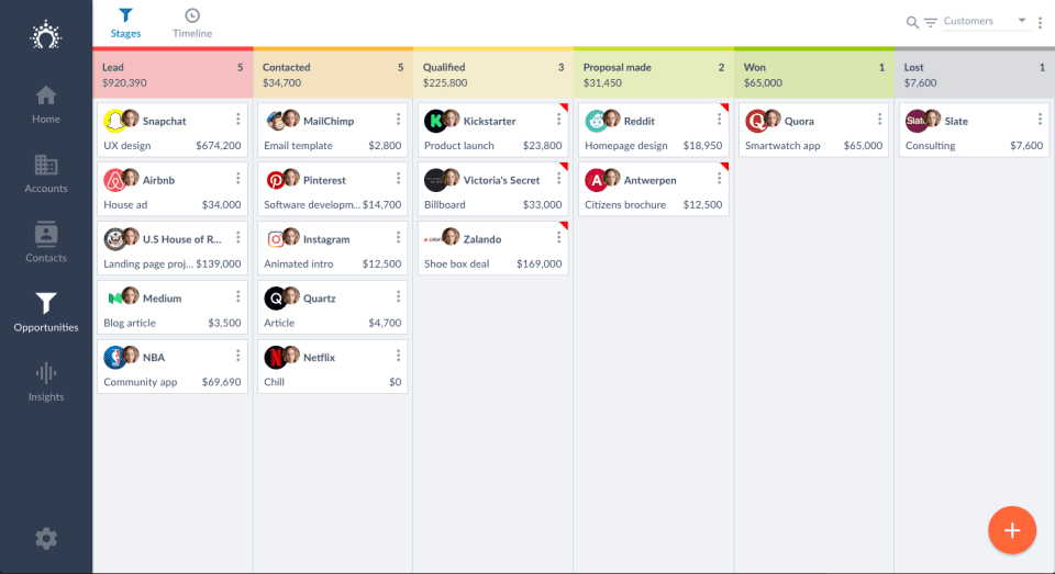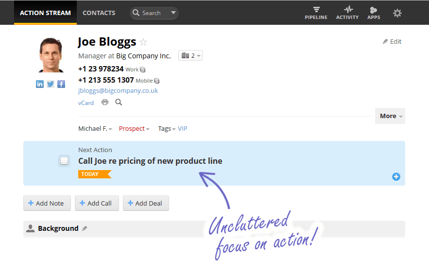 OnePageCRM is a simple, contacts-focused CRM. We take a to-do list approach to managing sales leads, where every contact has a next action to ensure you always follow-up. Capture leads from Gmail, Outlook, Twitter and Facebook and create a contact in OnePageCRM in just one click. Manage deals and track your sales targets using our intuitive sales pipeline. Integrate with all your favorite business apps. Got a question? We’re available via phone, chat, and email.