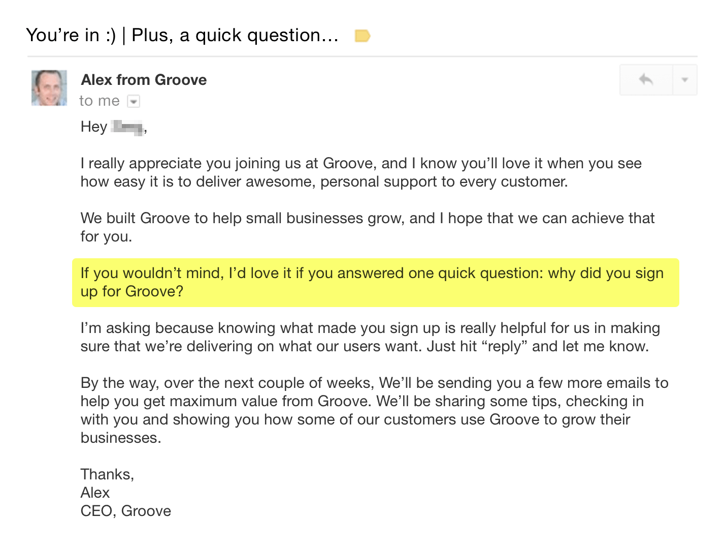Whenever you engage in any kind of communication with your customers, start a conversation—about them. At Groove, whenever someone signs up, we ask them why.