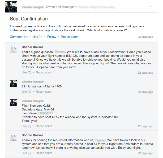 Rather than having to email or call, KLM’s customers who are already on LinkedIn can get their issues resolved within a social network that they’re already on:
