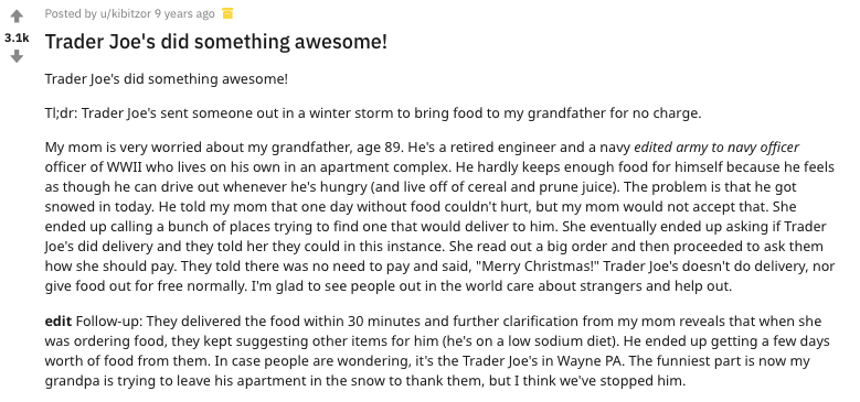 Long before grocery delivery was a thing, a Trader Joe’s in Wayne, Pennsylvania, came to the rescue to help an 89-year old man stuck in his apartment during a snowstorm.