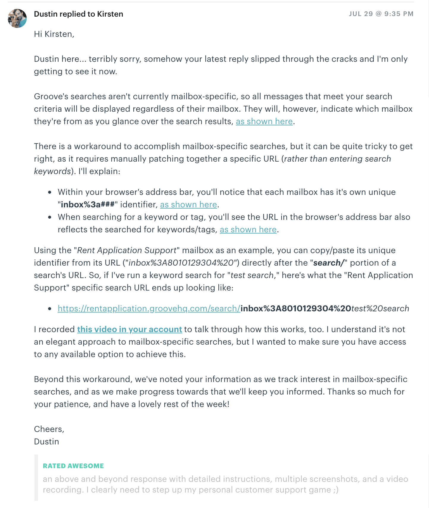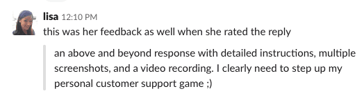 Just look at his response from a recent customer question, which Alex (our founder and CEO) saw and then posted to our #awesome channel in Slack: