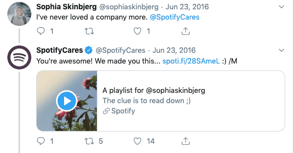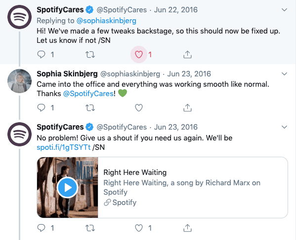 Spotify responded quickly with a follow-up question. A little while later, it responded again with a note that the problem had been resolved after they made “a few tweaks backstage.”