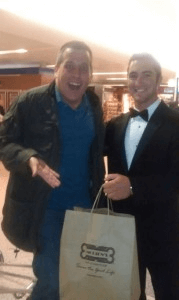 That’s a man in a tuxedo holding a bag of food from Morton’s Steakhouse.