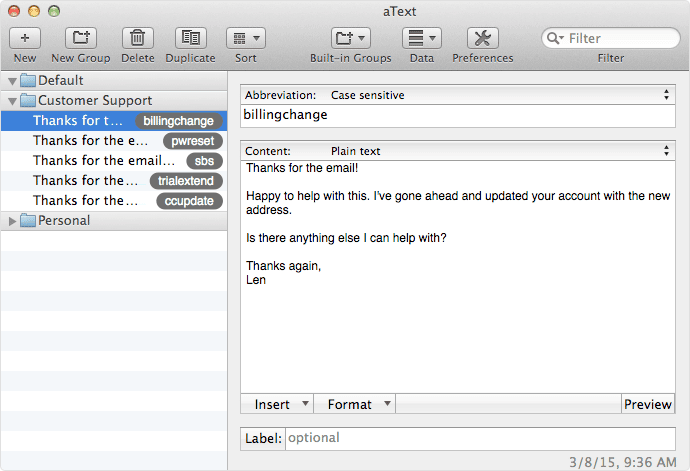 If you’re not using a help desk that offers common replies, you can still take advantage of this time-saving tactic. I’m a huge fan of aText for Mac (for PC’s, try PhraseExpress), which lets you create keyboard shortcuts. You could create something as simple as a shortcut to save you a few keystrokes typing your email address, or something as powerful as a shortcut for an entire paragraph-long email.
