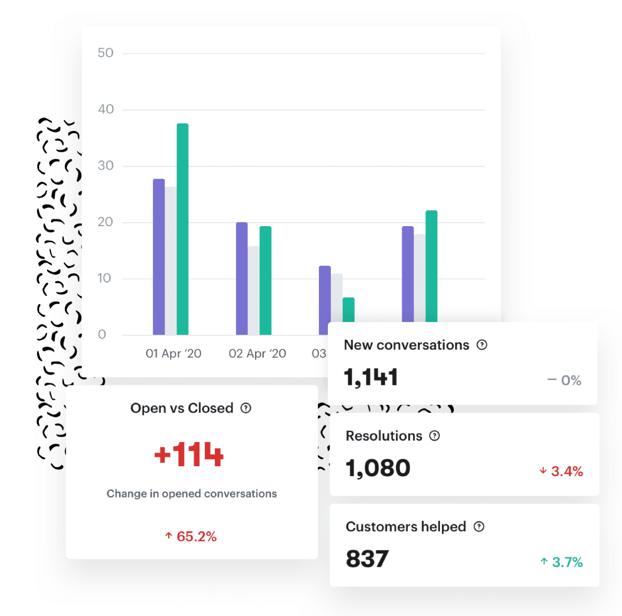 The key is knowing what to track – and then what to do with it. There’s external information, like requests received, support tickets opened, time of day, frequent channels, and (of course) overall satisfaction. Then, you have internal information, like response times, resolution times, average replies per resolution, and team member performance.