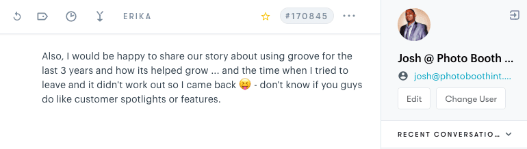Photo Booth International was also an early user of Groove, although—based on the advice of a business consultant—Josh tried a couple of other customer support solutions along the way, including Freshdesk and Zendesk.