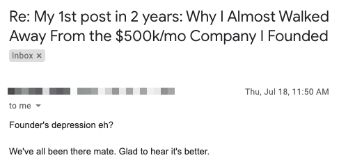 Since I got that email, I’ve spoken with over a dozen founder friends, and without exception, every single one who has experienced depression during their entrepreneurial journey has chalked it up to “founder’s depression.”
