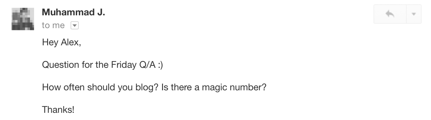 Unfortunately, as far as I can tell, there’s no single best answer here. Derek Halpern says a few times a month is fine. Neil Patel, on the other hand, writes 8 blog posts a week (I’m exhausted just typing that).
