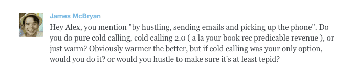 In the early days, I called and emailed plenty of people that were completely cold (i.e., had no idea of my existence, and we knew nobody in common), tepid (perhaps I send a warmup email) and warm (we’d had a friendly conversation before or been introduced).