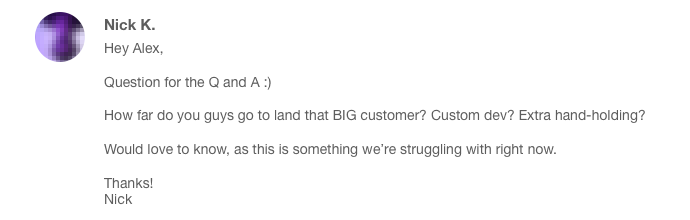 It’s especially tough when you’re bootstrapping, and you’re Ramen profitable, and you start getting recognized brands calling you up saying hey, if you just build this feature, we’ll buy. It’s so tempting, but it’s also a huge distraction. We fumbled around for two years trying to do everything for everyone, and it took a lot of discipline to get focused. In order to have a business that’s actually a good operating business we needed to pick a tightly defined customer segment, focus, go after it and win.