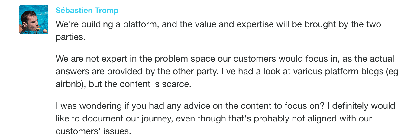 This is a great question, because it gets at an interesting challenge: content marketing success comes from writing posts that your audience feels was written just for them. But how can you accomplish that when you’re a two-sided platform and have two totally distinct audiences?