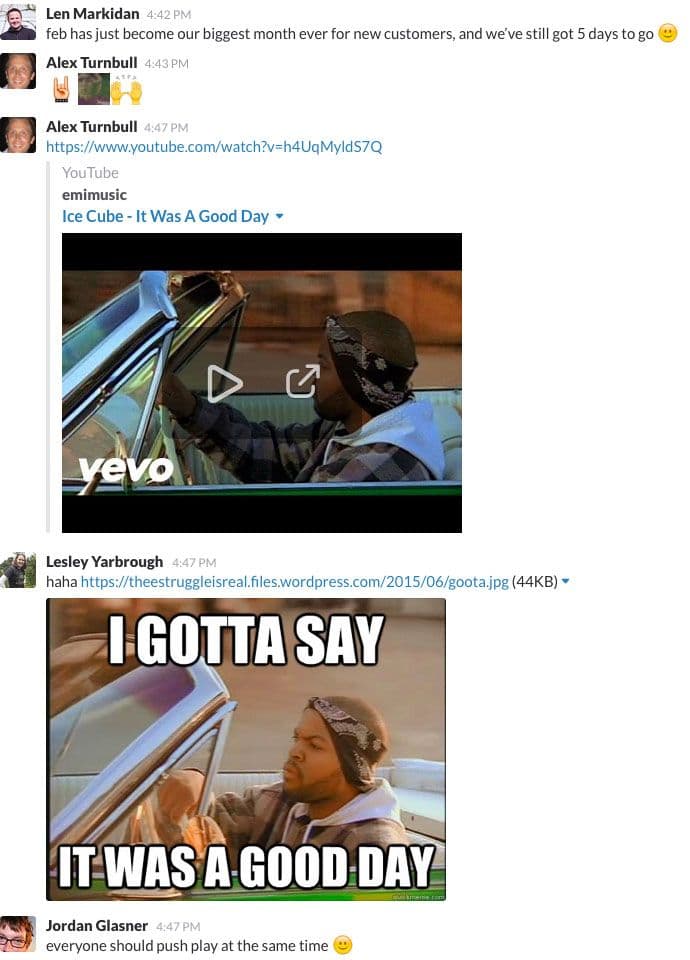 Celebrating—and doing it very regularly—is a massively important part of your team’s culture. As a startup, you go through a lot together, even if you’re not in the same room. Being able to commemorate those wins when they happen helps to keep morale high and the whole team motivated to fight on.