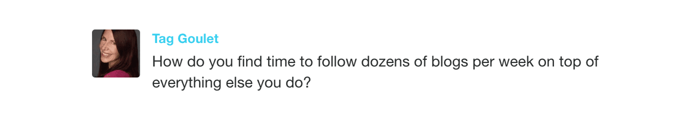 - Make it easy on yourself by putting your favorite blogs into an RSS reader (Newsblur is my tool of choice, though there are many good ones) that you can scan once or twice a day for new posts. This makes it easy to stay on top of what’s going on.