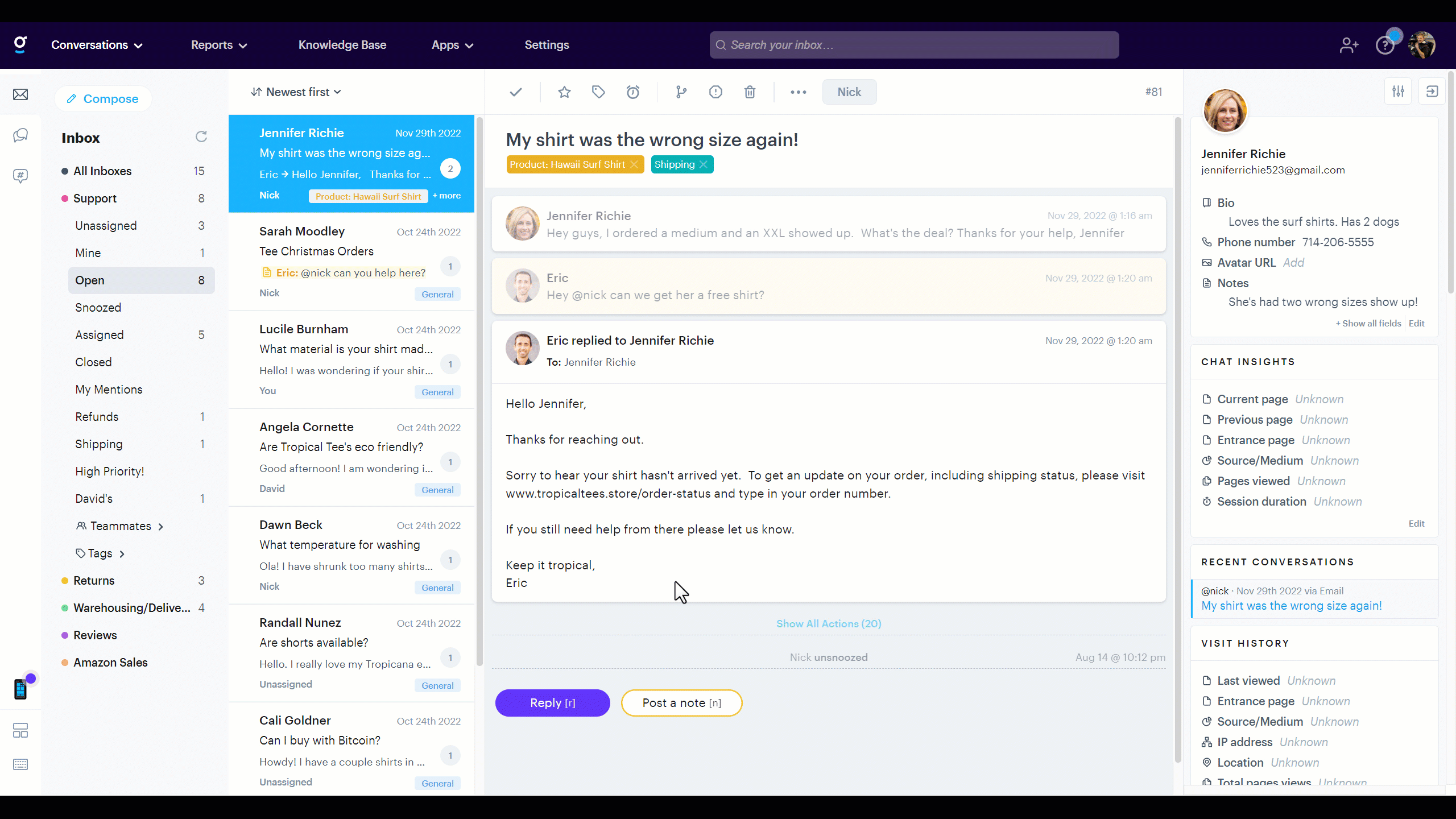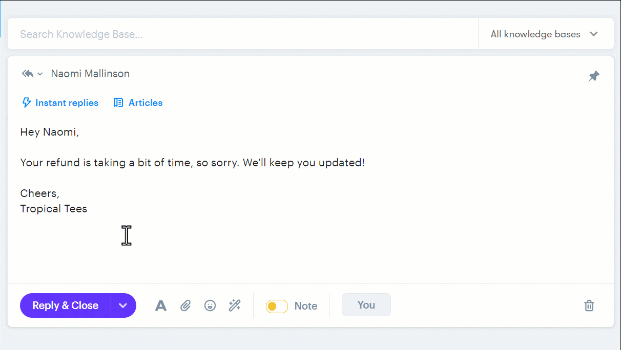 - Actions: Add/remove tags, change status, snooze, or assign conversations automatically when using an Instant Reply. Automate repetitive tasks to keep your workflows moving like a well-oiled machine.