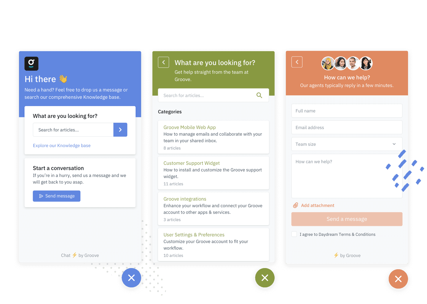 We built the new Groove Widget from the ground up, taking in all the great feedback from our customers (thank you!) over the last few years. The new widget has a clean modern look with fully customizable branding features (select your own colors and logo).