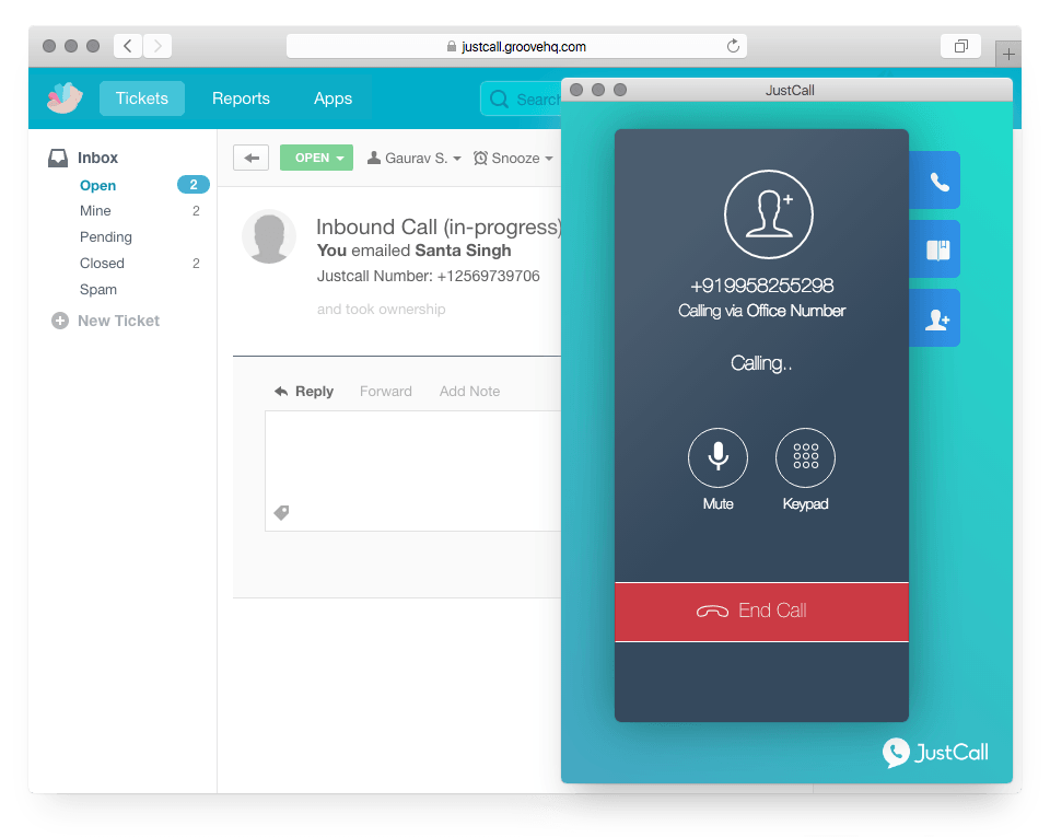JustCall is an anytime, anywhere, any-device phone system for your sales and support teams. With the Groove integration, all of your call logs and call recordings are directly accessible from your Groove dashboard and mailboxes, and tickets are created whenever there is an incoming call from a customer or an outbound call from an agent.