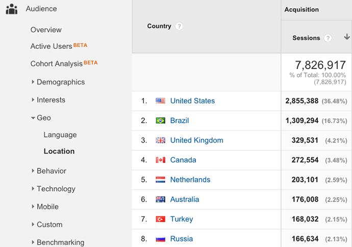 To see where your traffic is coming from, just choose Audience in the left sidebar, and then select Geo, and Location.
