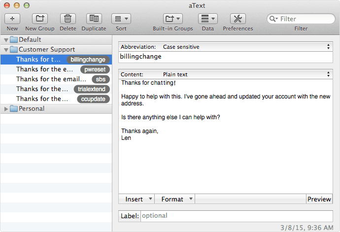 I’m a huge fan of aText for Mac (for PC’s, try PhraseExpress), which lets you create keyboard shortcuts. You could create something as simple as a shortcut to save you a few keystrokes typing your email address, or something as powerful as a shortcut for an entire paragraph-long email.