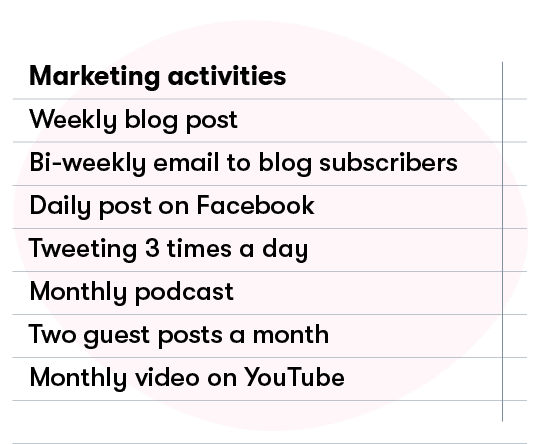 This where you create a list of every. single. one. of your marketing activities—everything you do that can be in any way called marketing.