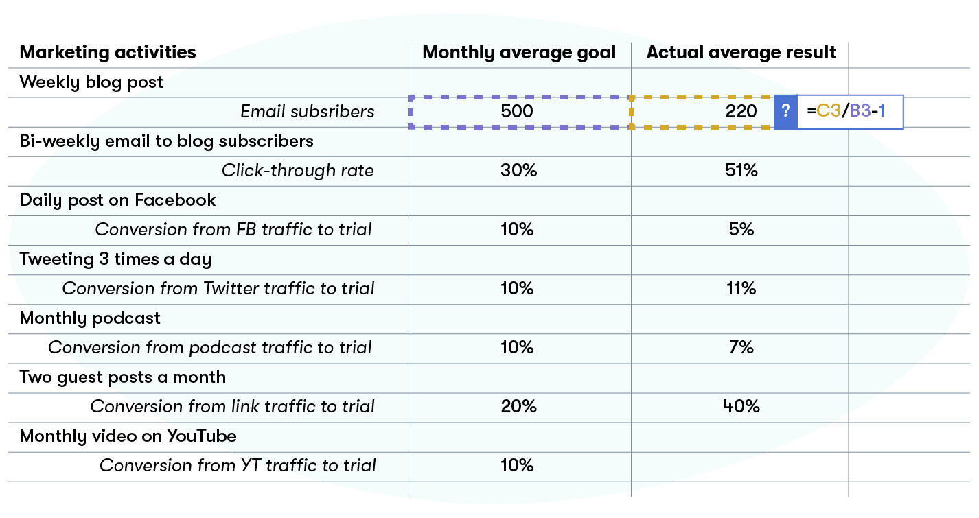 You have your goals and actual results written down in your spreadsheet. This is where a super cool formula comes in. You’ll like it.