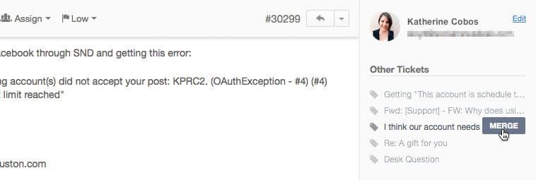 Now, to merge the ticket you’re viewing with a previous ticket, you can simply hover your cursor over the ticket, and a Merge button will appear.