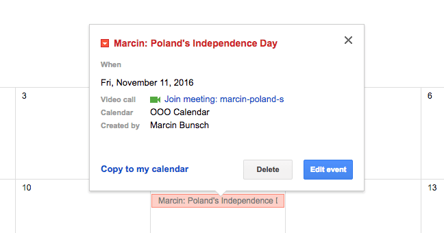 - Google Calendar: Nine different time zones means different countries, and different countries means different holidays. We have a shared Google Calendar where team members put vacations and local holidays when they won’t be working, so that we’re not left wondering why someone isn’t responding that day.