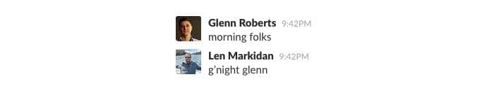 Rather than try to avoid off-topic banter, we encourage it in Slack, especially in those couple of hours each day when most time zones overlap; for us, that’s between 8 AM and 10 AM EST, in the hours before our daily call.