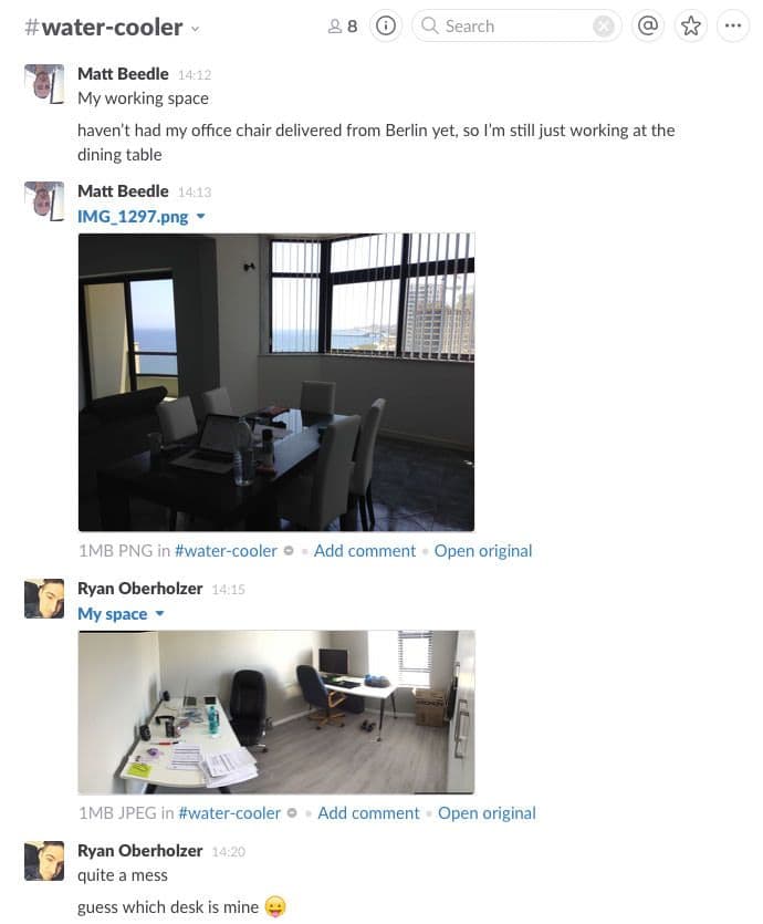 In a traditional office, the water cooler is the place where people talk about their personal lives. Where they “shoot the shit” and build relationships with the rest of the team.