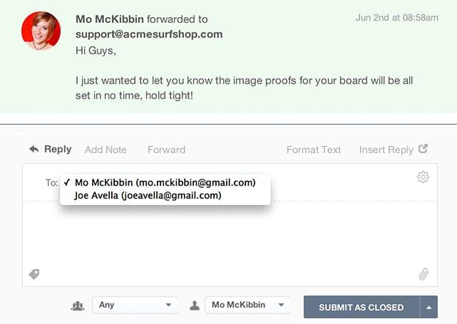 Drop-down Menu for Forwards: We’ve applied a drop-down menu for the To field on your replies that includes all parties involved in a ticket thread once three or more people enter the same forwarded conversation. Now you can easily select who you send your next reply to from anyone in your communication chain.