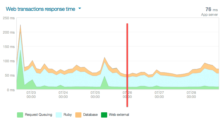 Last Saturday we gave our database a makeover, increasing it’s size and processing power. You should have noticed a much faster Groove this week, even during peak periods. As you can see from the chart below, all transactions after the database upgrade on July 26th (red line) occur under 100ms.