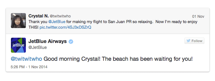 One company that does this really well is JetBlue. You can learn a lot about tone by watching their Twitter feed.