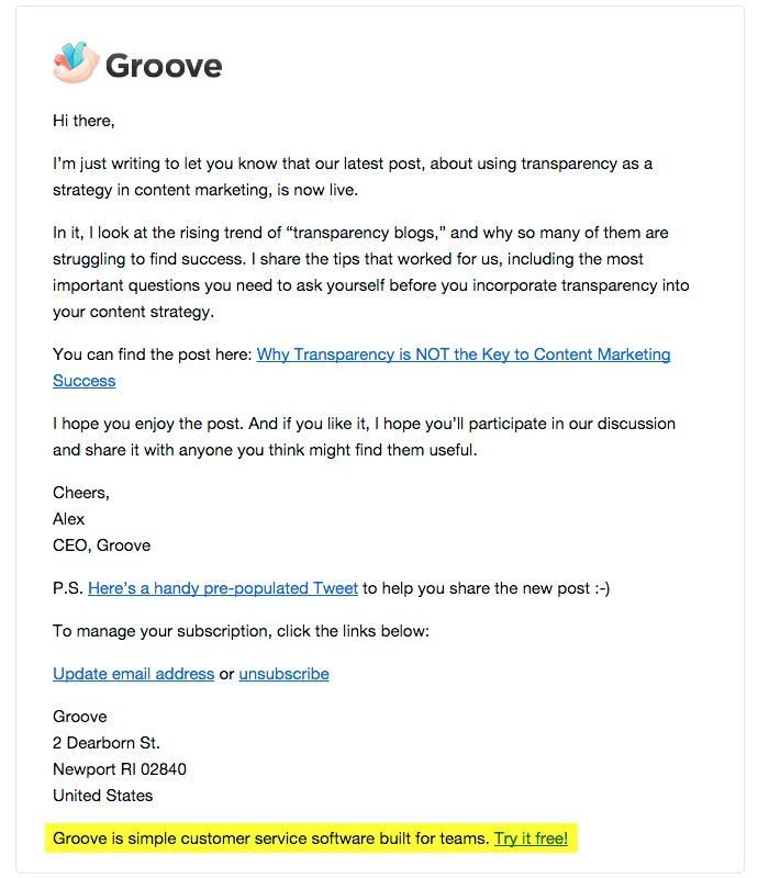To see if we could get past the “you stopped asking us” issue, we added a simple “P.S.” line at the bottom of every single blog email that we send that reminds the subscriber what Groove is, and offers a free trial.