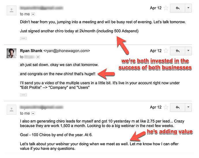 After this guy came on board as a paying customer, I continued to reach out and provide value relating to his business. One of my buddies is a chiropractor in New York and I emailed him asking if he would like a referral (huge value!).