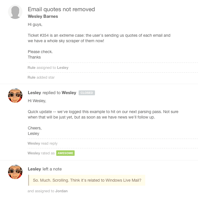 Now, right within the ticket thread, you can see what actions were taken and the agents who took them.
