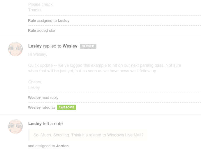 You’ll see things like status changes, priority changes, assignments, snoozes, and read receipts. You can also see when a rule runs against a ticket and causes one or more of these actions.