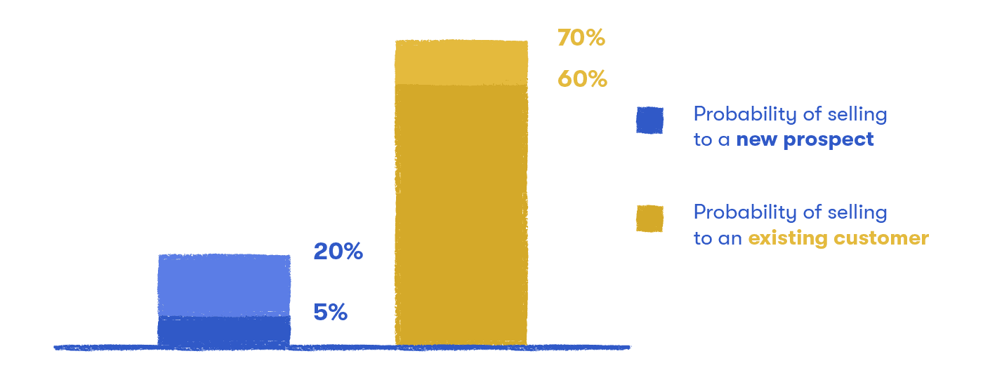 The probability of selling to a new prospect is 5-20%. The probability of selling to an existing customer is 60-70%.