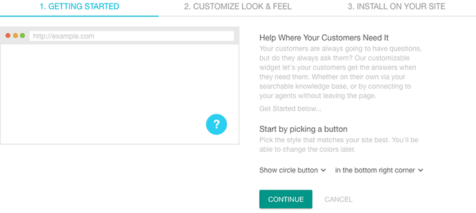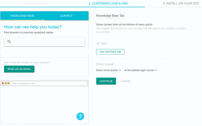 While customizing the look and feel your widget, you can toggle between the Knowledge Base and Contact tabs to adjust the settings for each piece of the widget. As you go, you will see your changes in a real time preview, so you know exactly what it’s going to look like when it’s live.